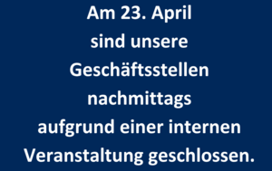 Am Donnerstag, 23. April, sind unsere Geschäftsstellen aufgrund einer internen Veranstaltung nachmittags geschlossen.